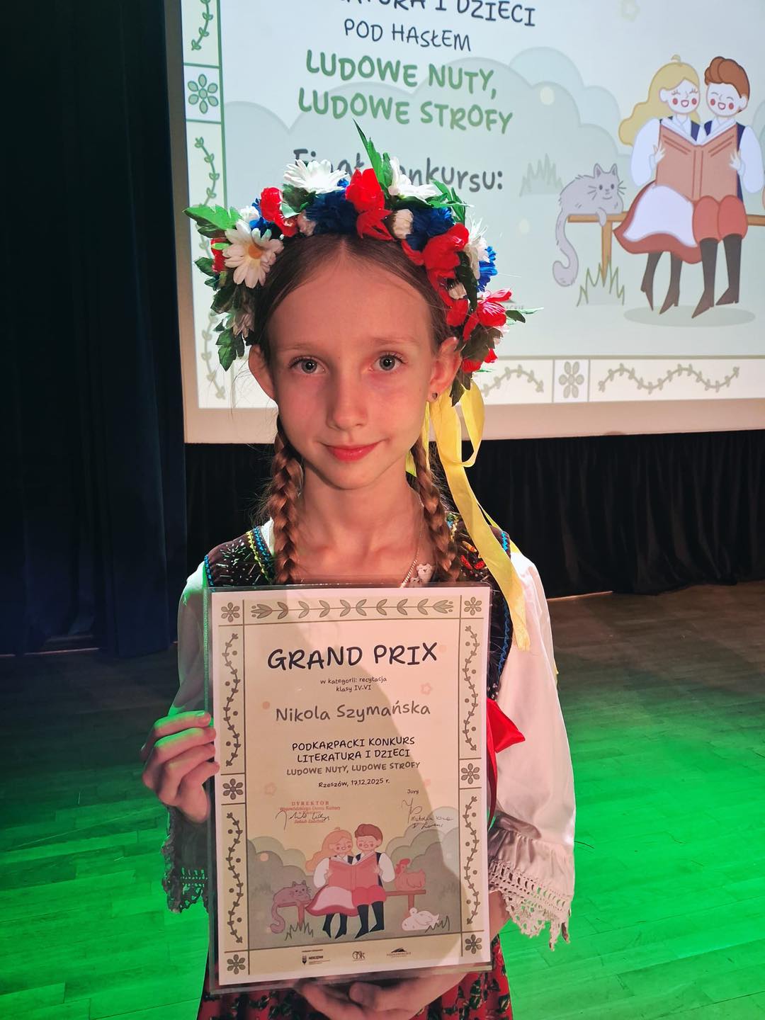 Urszula SachaZ ogromną radością i dumą informujemy, że nasza uczennica, Nikola Szymańska, zdobyła Grand Prix w finale Podkarpackiego Konkursu „Literatura i Dzieci” w kategorii recytacja. Nikola zaprezentowała utwór o dawnych daniach i zwyczajach związanych z jedzeniem. Laureatce serdecznie gratulujemy i życzymy podobnych sukcesów w kolejnym roku 2026.