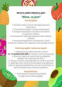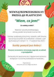 Zapraszamy serdecznie wszystkie dzieci z naszego przedszkola do konkursu plastycznego "Wiem, co jem". Szczegóły poniżej.
